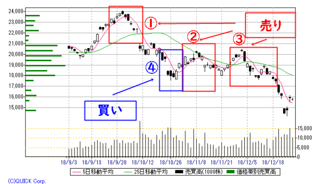 ③は5日移動平均線と25日移動平均線を一気にブレイクダウンしています。絶好の売りサインとなっています。