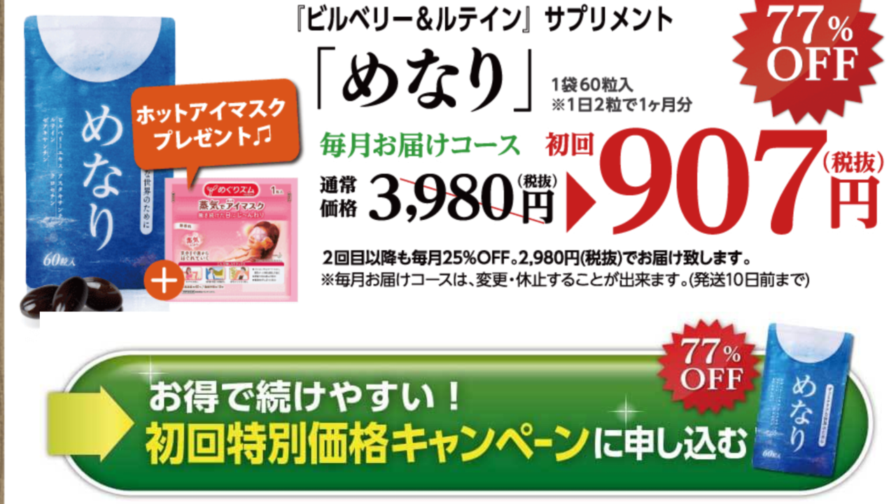 めなりの初回価格が凄い|アイケアに特化したサプリメント!