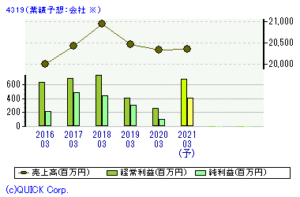 | TAC(4319) <東証1部> | 会社概要 会計、法律の資格取得スクールを全国展開。法人向け研修に強み。 業種 サービス 会社URL https://www.tac-school.co.jp/<業績推移>(億円)※1株益・1株配は円 ![]() ![]() 決算期 売上高 経常益 最終益 1株益 1株配 発表日 2019.03 204.7 4.1 3.1 16.7 8 19/05/15 2020.03 203.3 2.6 1.0 5.6 5 20/05/15 2021.03(予) 203.5 6.8 4.1 22.2 5 20/05/15 前期比(%) +0.1 2.6倍 4.0倍 4.0倍PER 8.9 PBR 0.67 配当利回り 2.53% 決算月 3月 |