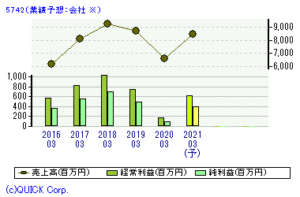 | NIC(5742) <東証JQS> | 会社概要 アルミ製部材メーカー。アルミフレーム・クリーンブース関連・FA装置などに強み。富山地盤。 業種 非鉄金属 会社URL http://www.nic-inc.co.jp/<業績推移>(億円)※1株益・1株配は円 ![]() ![]() 決算期 売上高 経常益 最終益 1株益 1株配 発表日 2019.03 87.2 7.5 4.9 90.4 39 19/05/10 2020.03 66.1 1.8 1.0 18.4 39 20/05/08 2021.03(予) 84.7 6.1 4.0 73.4 41 20/05/08 前期比(%) +28.0 3.5倍 4.0倍 4.0倍PER 11.1 PBR 0.96 配当利回り 5.02% 決算月 3月 |