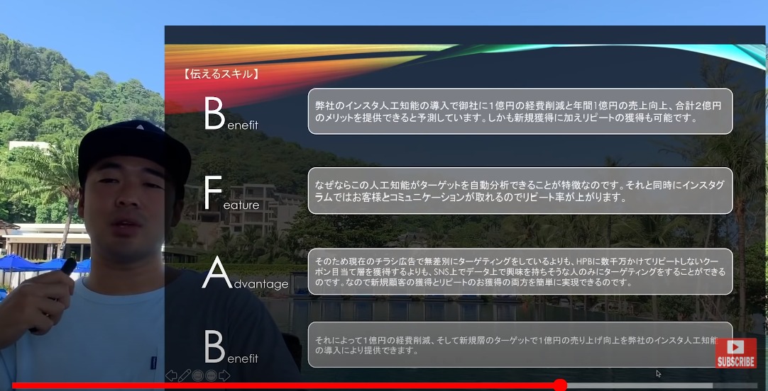プレゼンに行く前にしっかりとBFABに基づいてBFABをまとめ上げて10回繰り返して、見ないでも話すことが出来れば素晴らしい営業になると言い切る。