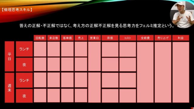 答えの正解・不正解ではなく、考え方の正解不正解を見る思考力をフェルミ推定という。