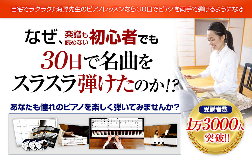 初めての方でも挫折しないように、最初は人差し指1本で 弾ける曲からスタートしています。 「弾けた!」という充実感を味わえるレッスンですので きっと初めてのかたも楽しく続けられると思います。 また、さまざまな角度から撮影をしているので、どうやって 先生が弾いているのか、 実際のレッスンよりもずっと分かりやすい≫ 口コミ評判はコチラ! ≪
